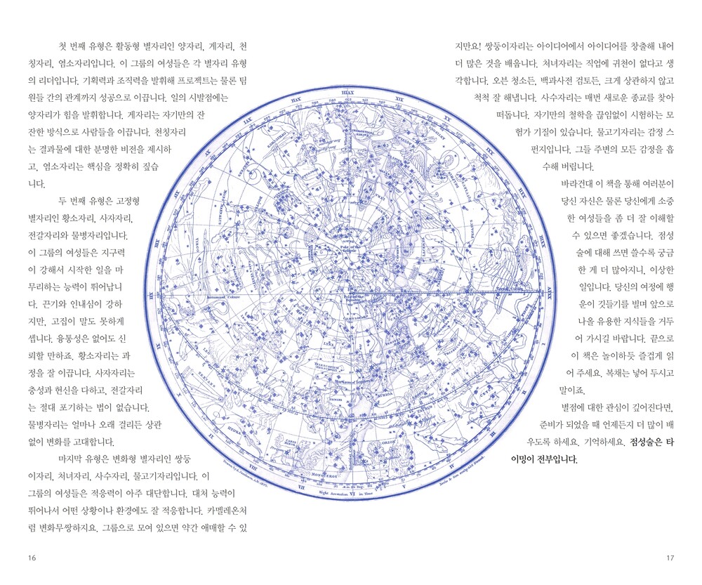2016. 나 점성술에 대해 잘 모르거든. 그런데 책이 도착한 날 밤 친구들과 가볍게 한잔하며 전 여친과 전전 여친, 현 여친에 대해 밤새 떠들었어.