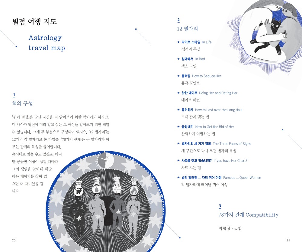 신년이면 진정한 사랑과 인생 해법을 찾아 점집 문을 두드리시나요? 요즘 핫하다는 앱을 찾아 생년월일을 넣고 인터넷 타로카드 점에 앞날을 건다고요? 미래를 내다보려는 당신의 모든 수고는 ‘기승전―이성애’로 귀결됩니다. 많은 역학과 점술은 고루하게도 여성과 남성 간 궁합을 보편값으로 두지요. 하지만 남자, 결혼, 자식만이 한 여성의 미래와 안전과 행복을 보장할까요? 설마요! 우리는 망한 과거도, 빤한 현재도 아닌 무지갯빛 미래를 꿈꾸잖아요. 유레카를 외치세요! 『퀴어 별점』은 여성과 여성의 별자리 조합을 78가지로 풀이해 섬세하게 분석합니다. 당신이 만약 퀴어 여성이라면, 여성 간의 궁합 정보가 담긴 흥미진진한 퀴어 운명 지침서를 놓치지 마세요!