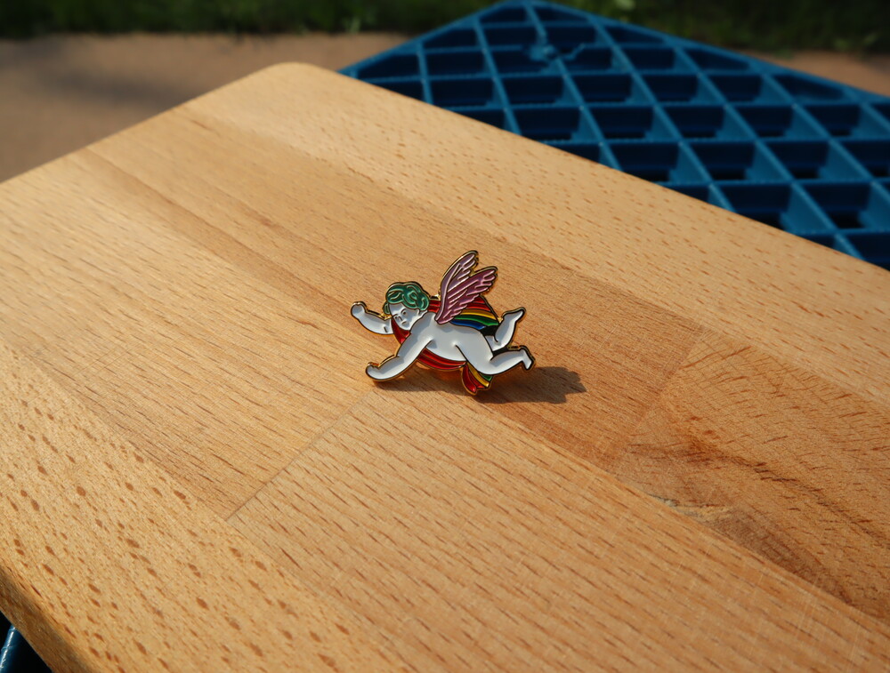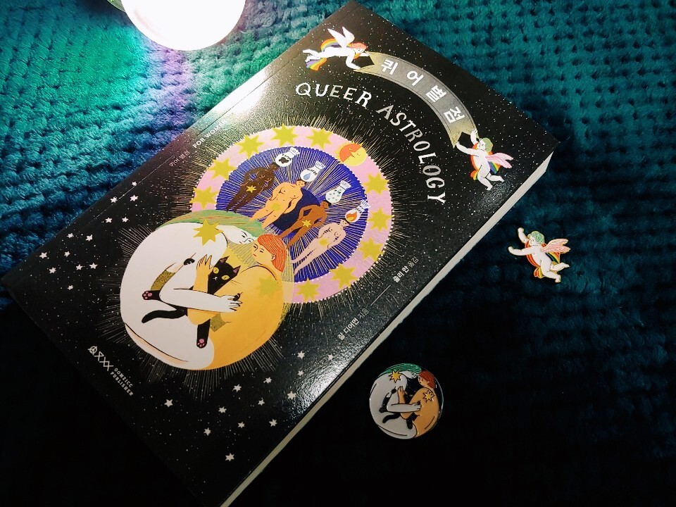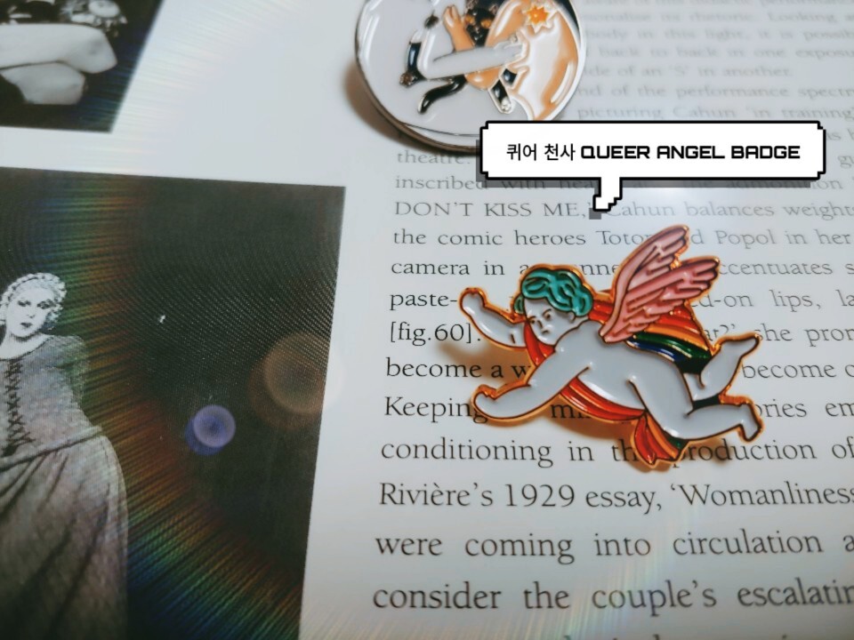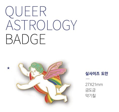 빼어난 미적 감각과 신비로운 이미지로 세계의 클라이언트를 놀라게 하는 윤예지 일러스트레이터의 그림으로 만든 책 『퀴어 별점』의 굿즈, 퀴어 천사 뱃지입니다. 무지개 키톤을 걸친 천사가 금빛으로 반짝이며 퀴어 프라이드를 높여 줘요!