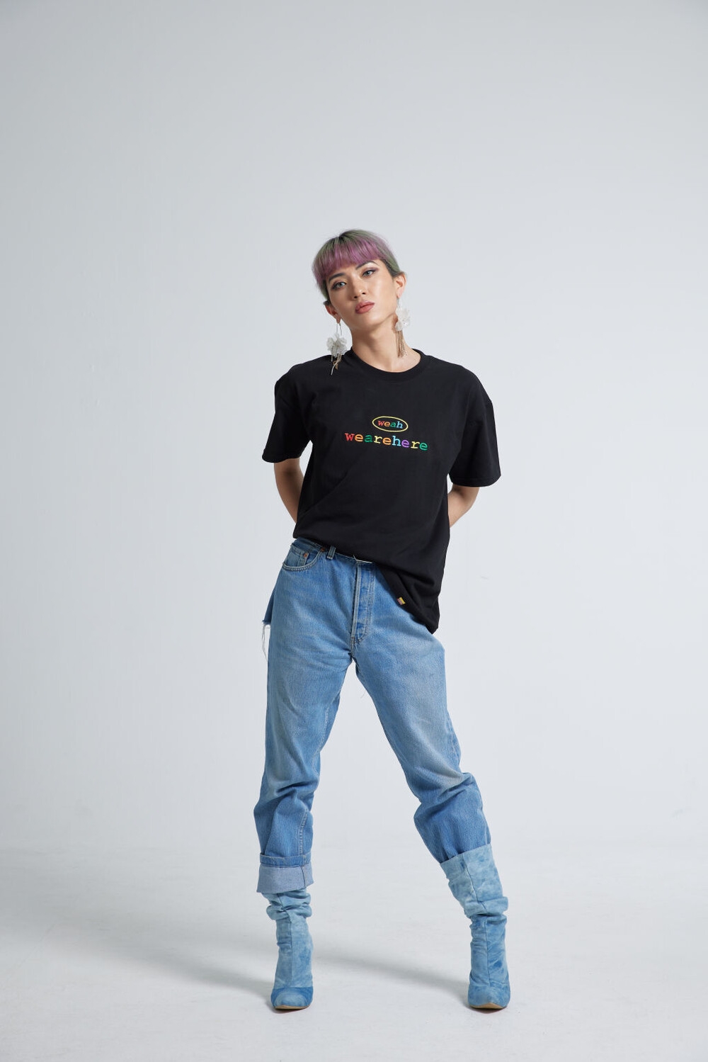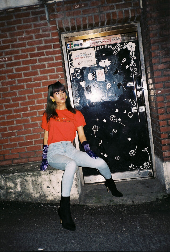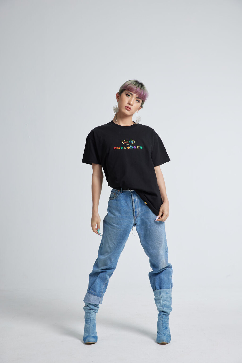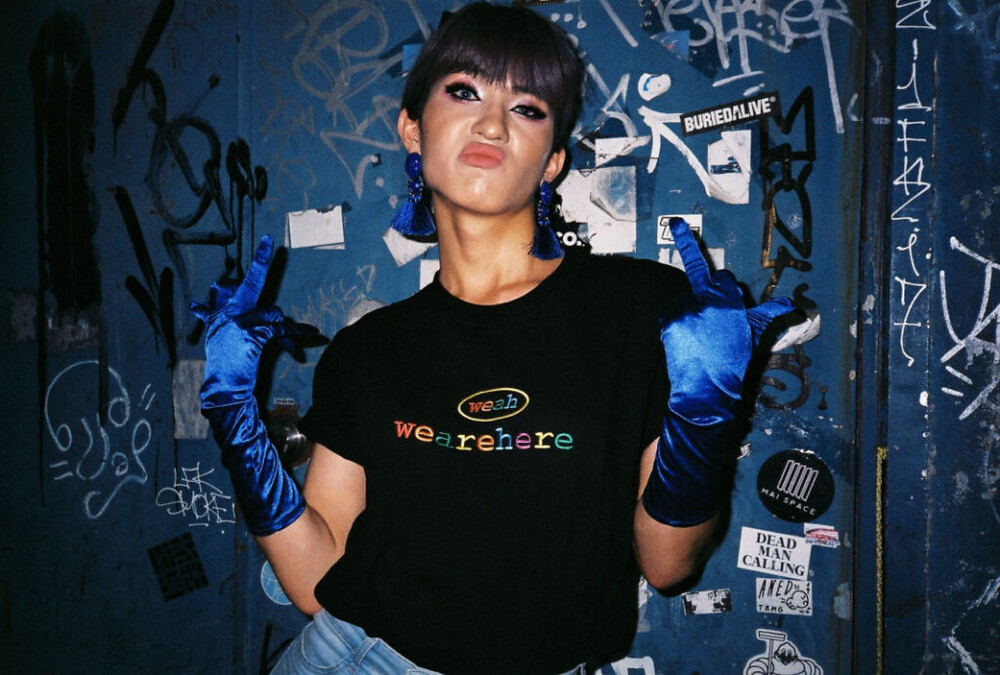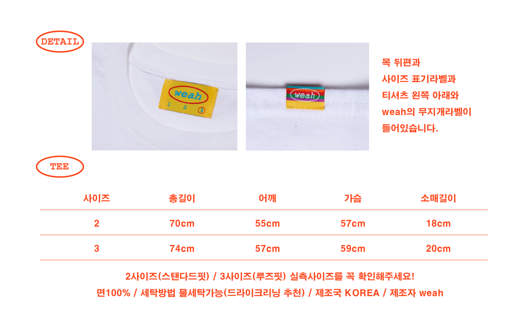 우리는 여기에 있고, 어디에나 있습니다. weah와 wearehere의 문구가 레인보우자수형태로 들어가 레트로한 무드를 연출할 수 있는 티셔츠입니다. 화이트/블랙/오렌지 세가지 타입 / 사이즈는 2, 3 두가지 타입으로 출시되었습니다.