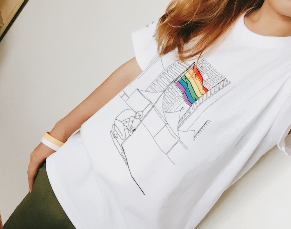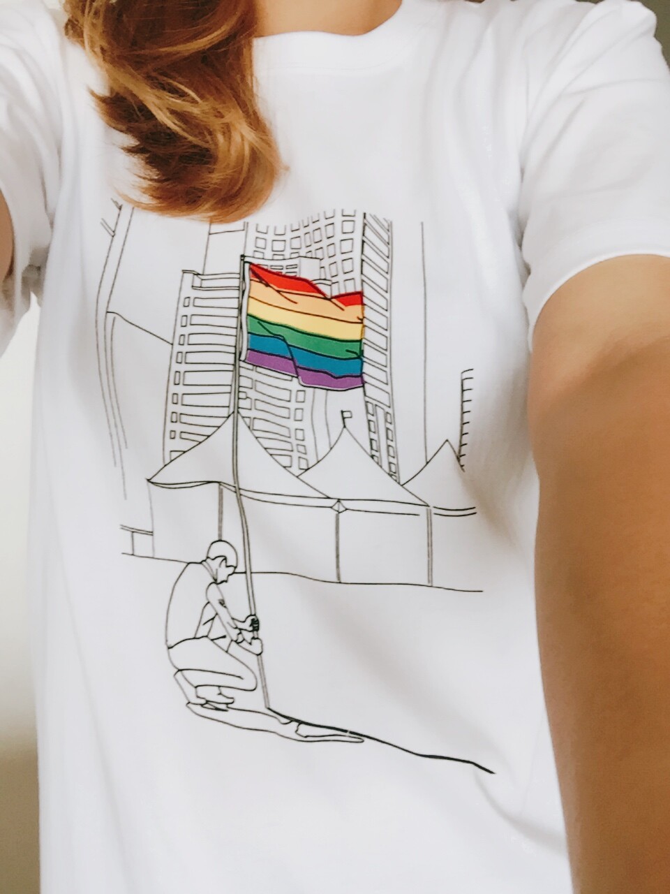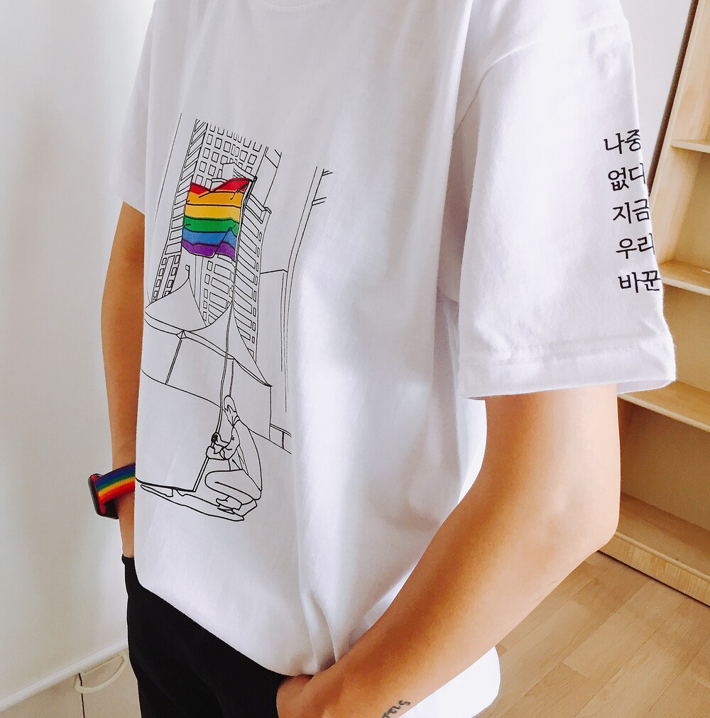 👕 광장에 무지개 깃발을 꽂으며슬로건 그래픽이 프린트된 티셔츠입니다. 앞면엔 그래픽이, 왼쪽 소매엔 ‘나중은 없다, 지금 우리가 바꾼다!. 문구가 프린트되어 있습니다.