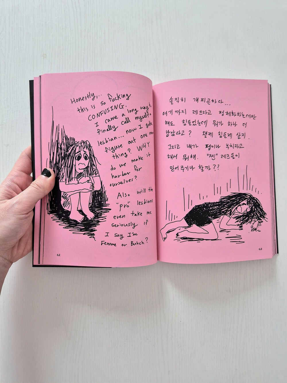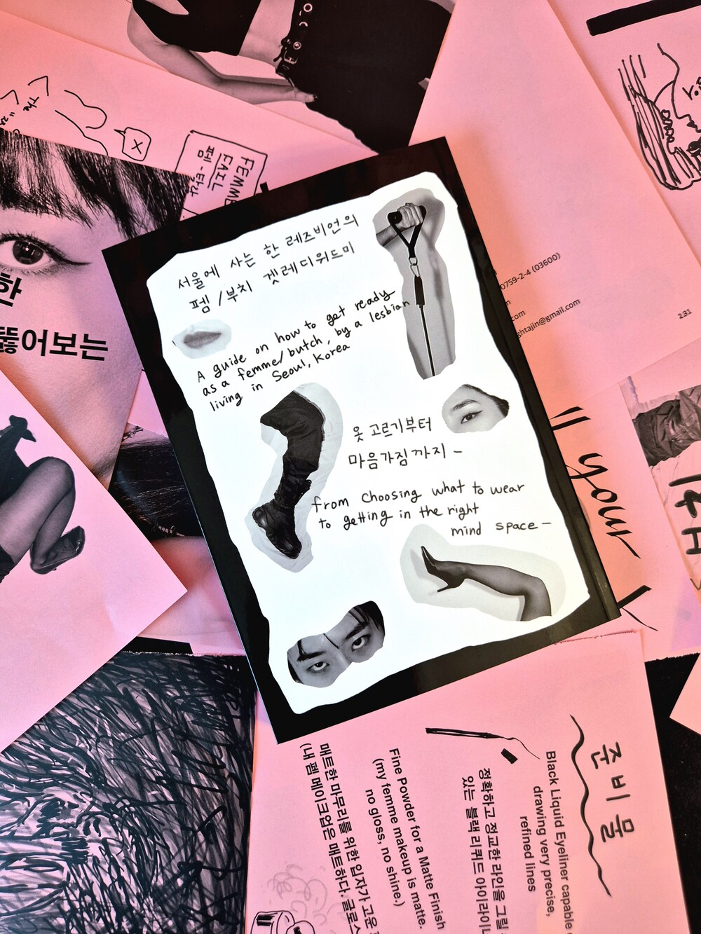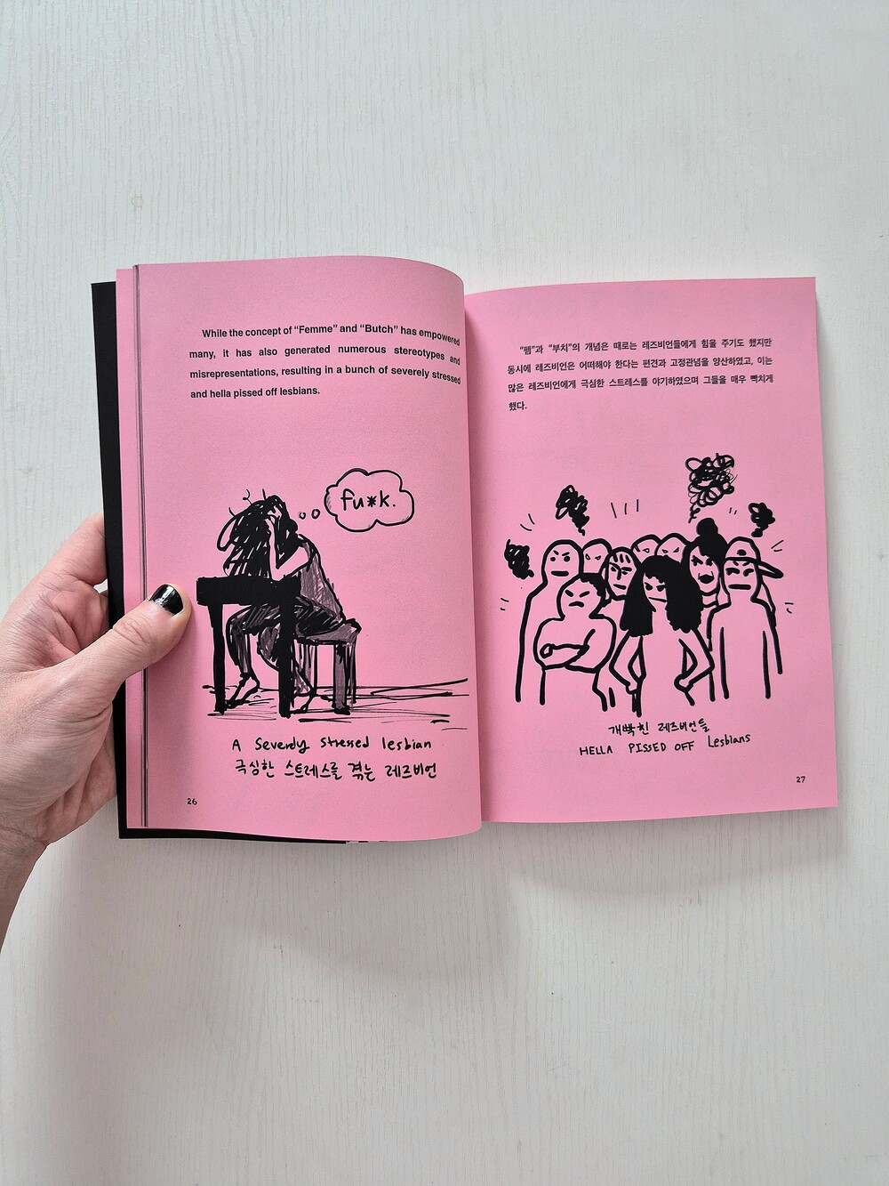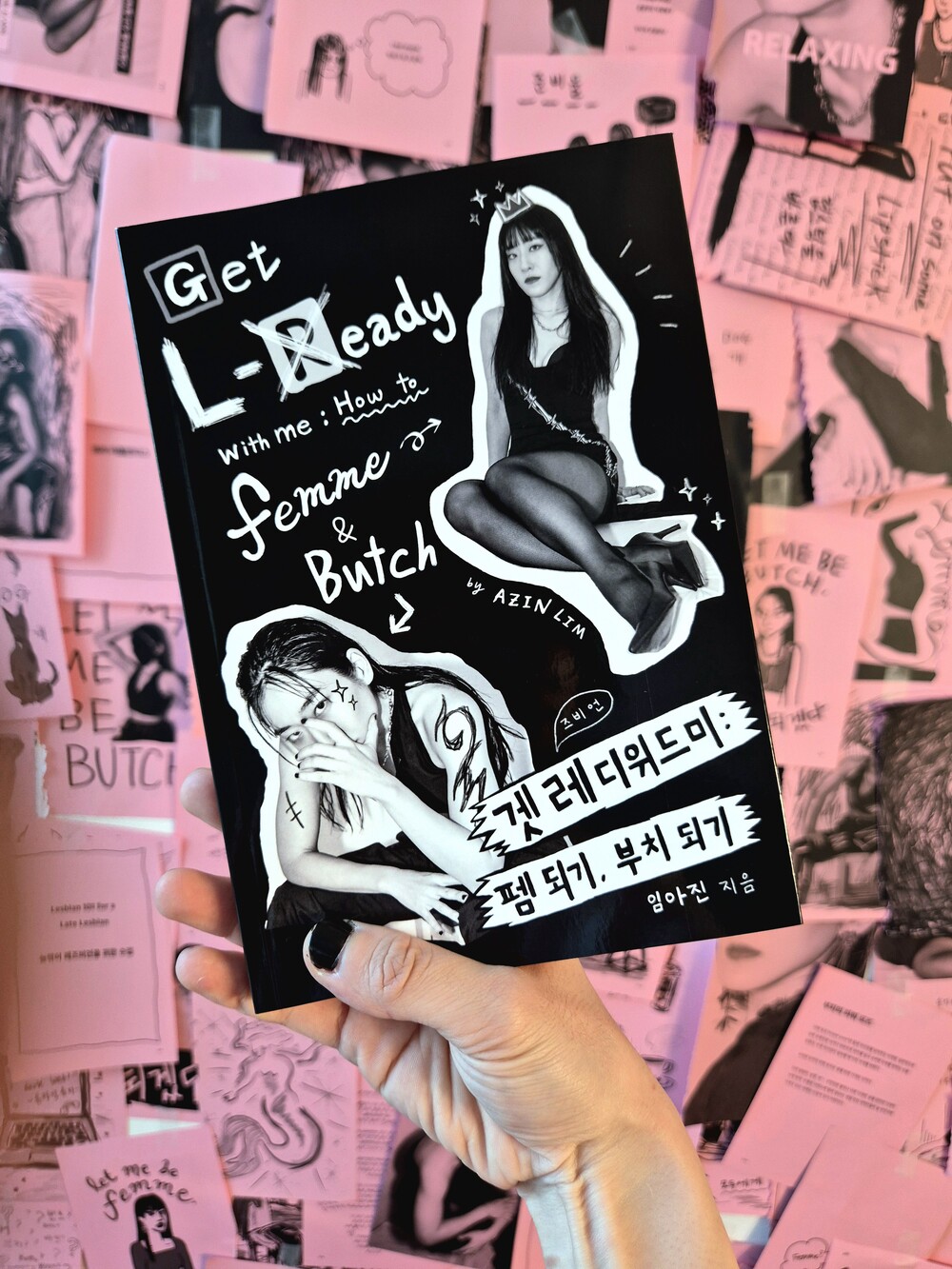 <겟레디위드미: 펨 되기, 부치 되기>는 레즈비언 정체화, 퀴어 커뮤니티 입문, 그리고 펨과 부치에 다다르기까지의 경험과 과정을 담은 책입니다. 드로잉, 에세이, 그리고 사진작가 Evi Neva와 협업한 펨/부치 초상화 시리즈의 사진으로 구성되어 있습니다.