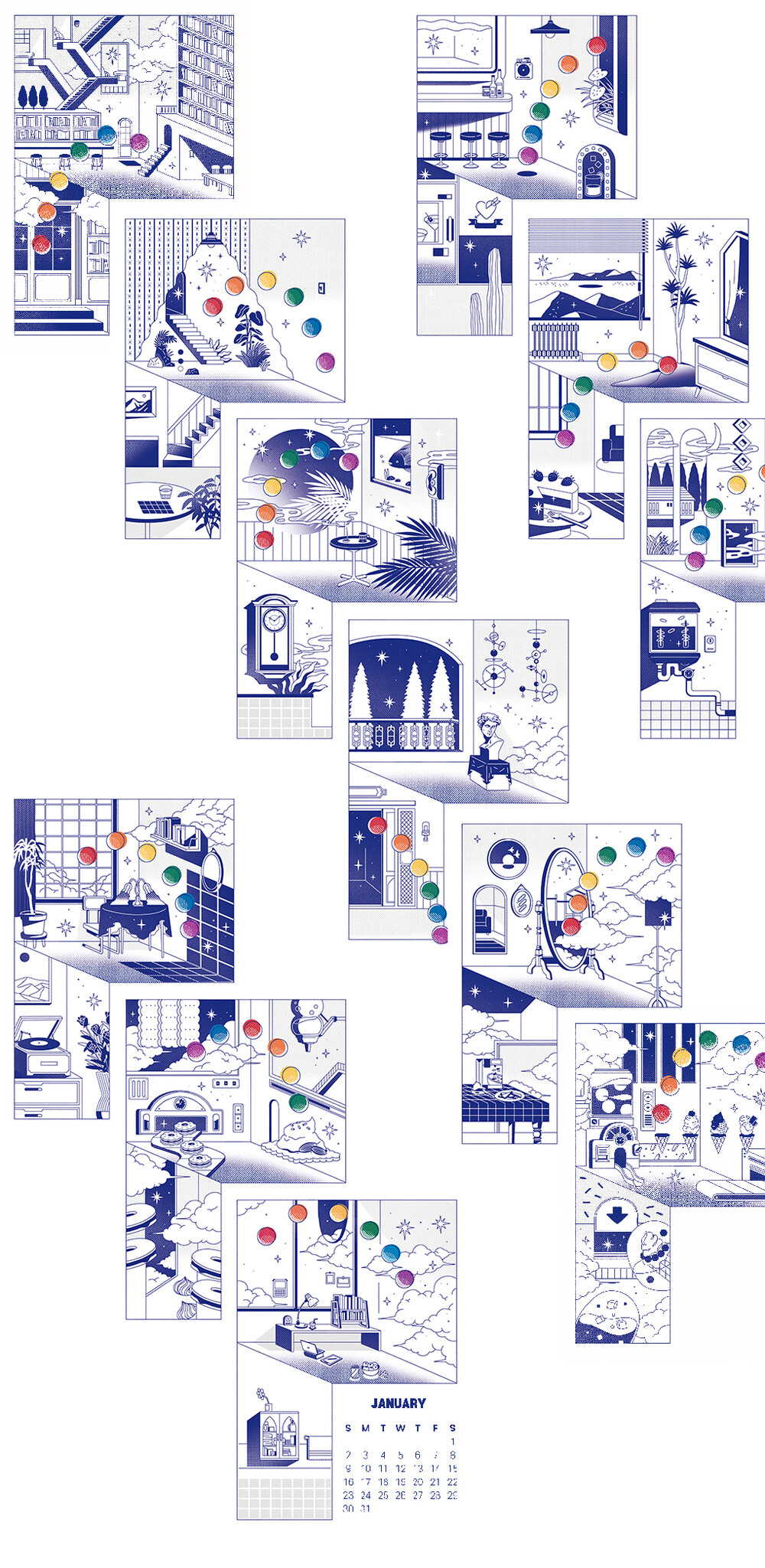 안과 밖의 경계도, 밤과 낮의 구분도 없는 환상적인 풍경을 서희님의 섬세한 그림으로 담아냈습니다. 낯설게 연결된 일상적인 단색의 풍경 속에 통통 튀는 선명한 무지개가 눈길을 사로잡는 매력적인 그림이에요.