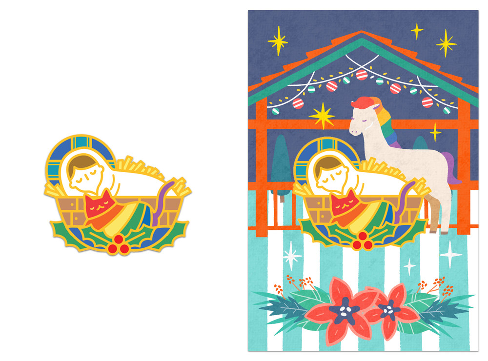 말 구유에 누워 무지개 고양이와 나란히 잠이 든 아기 예수님 뱃지입니다.