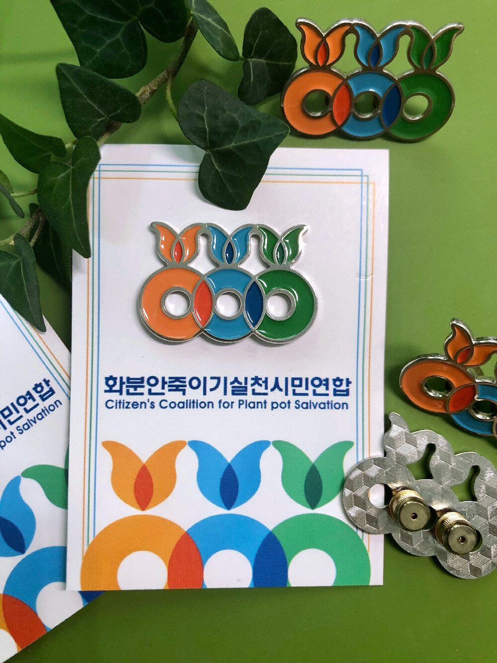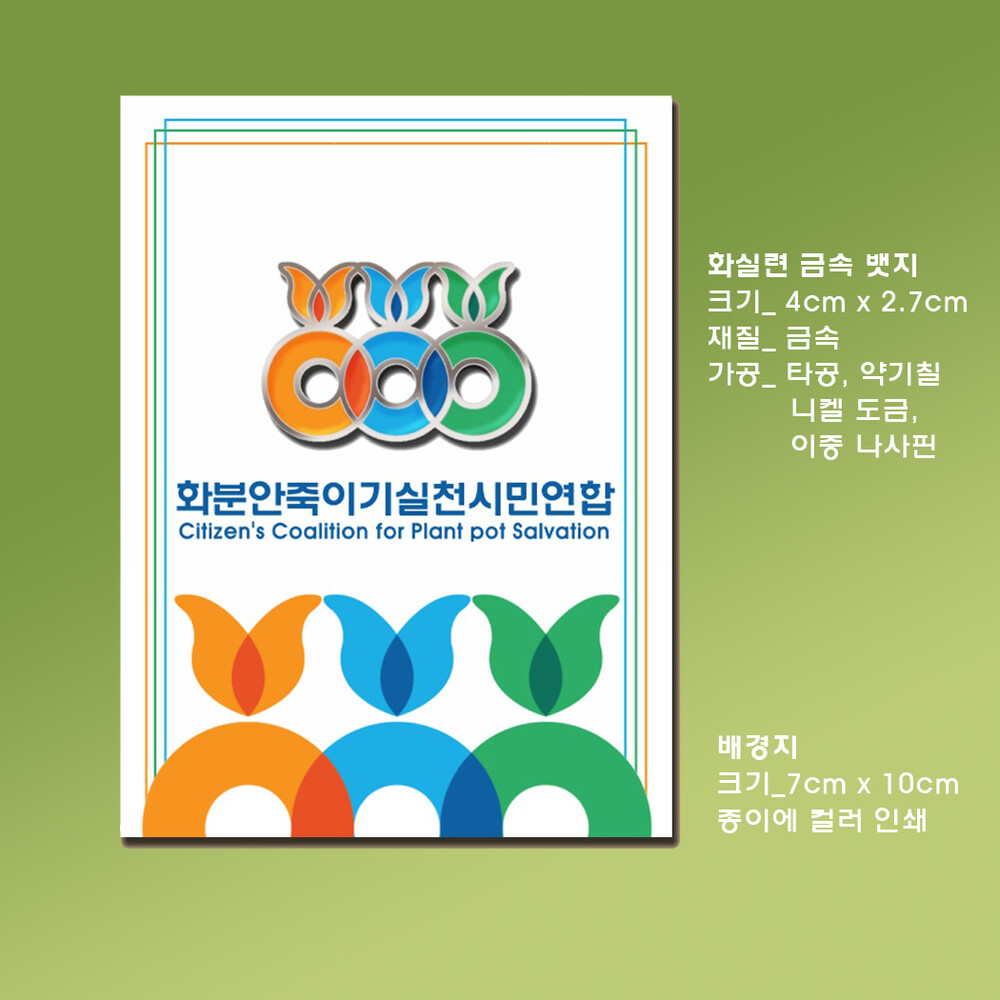 화분안죽이기실천시민연합의 상징을 정교하게 재현한 금속 뱃지입니다.