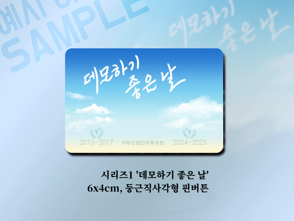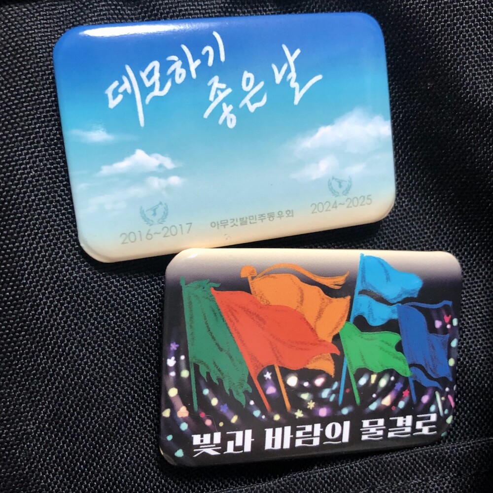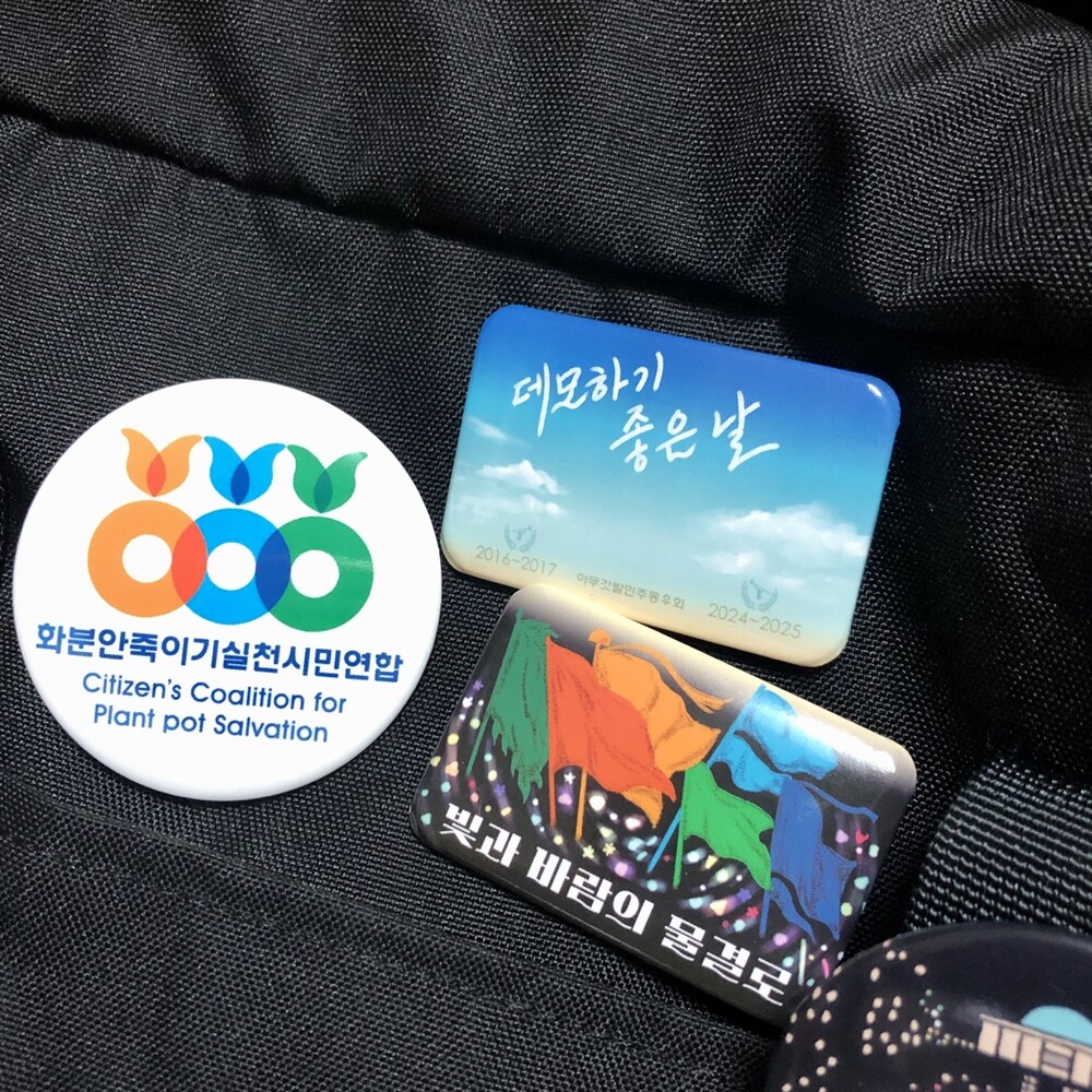 ◆ 화실련 핀버튼 세트 – ‘데모하기 좋은 날’, ‘빛과 바람의 물결로’ 핀버튼 세트
