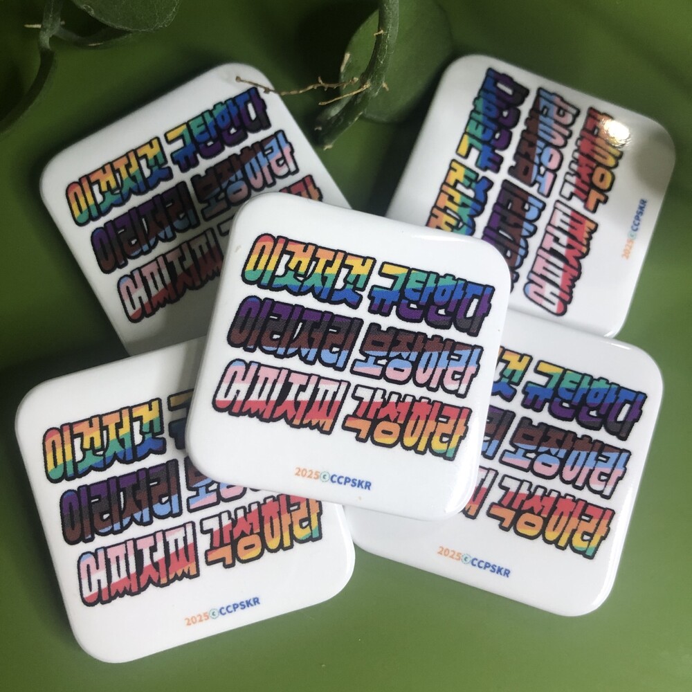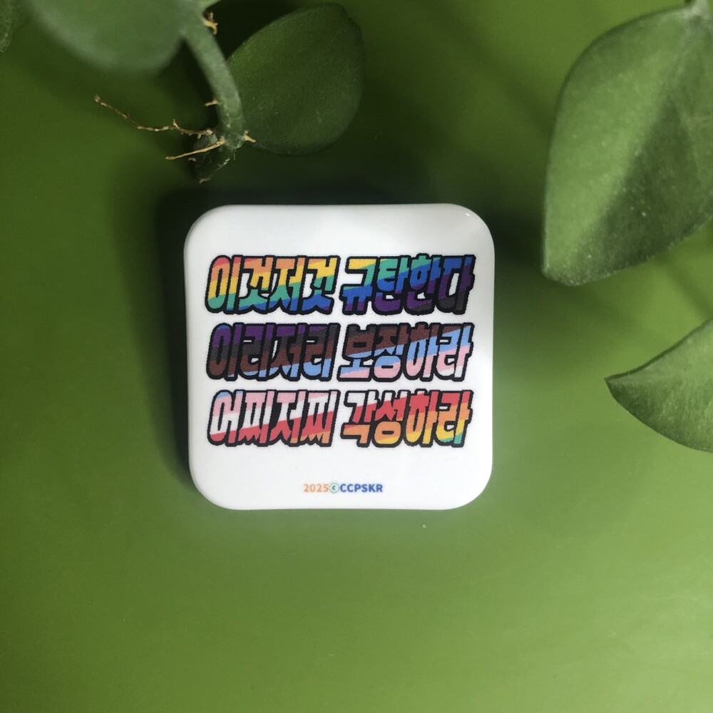 그렇습니다. 아직 규탄할 것이 많은 우리의 마음을 담았습니다. 포괄적 무지개 빛으로 이것저것 규탄할 수 있는 미니 핀버튼입니다. 이것저것 규탄하고, 이리저리 보장하고, 어찌저찌 각성하도록 힘을 모아 나아갑시다.