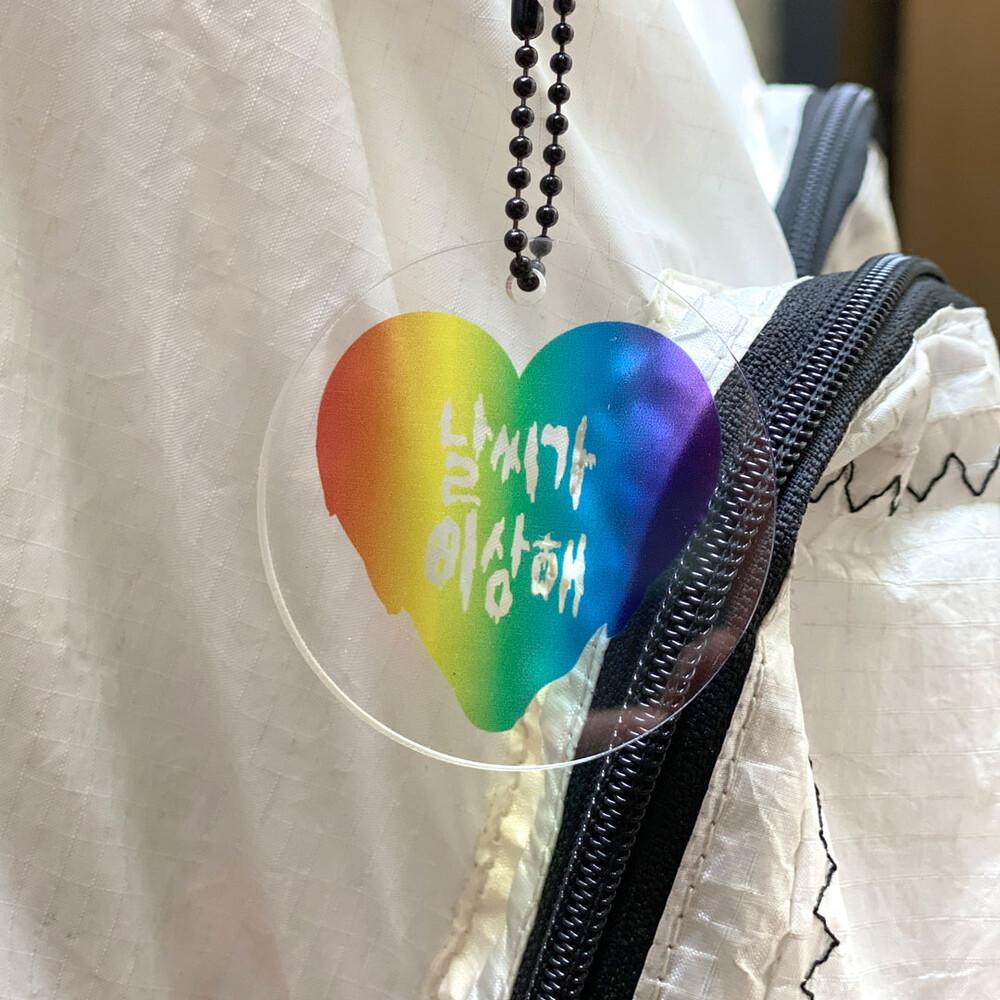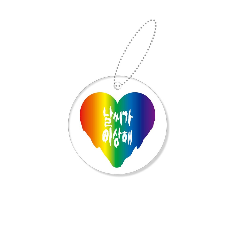 - 투명한 아크릴 원형에 무지개 하트 배경에 날씨가이상해 메시지 실크스크린