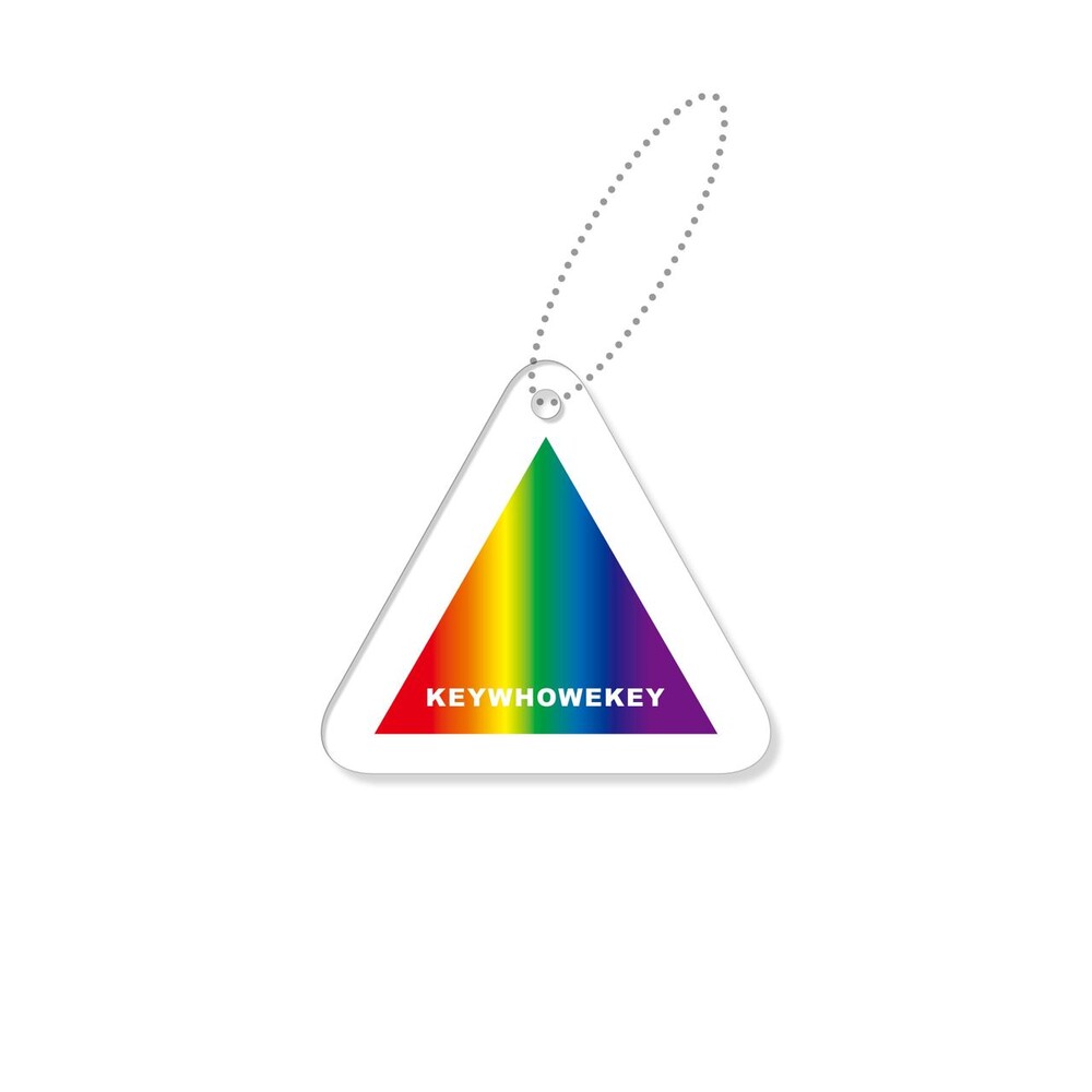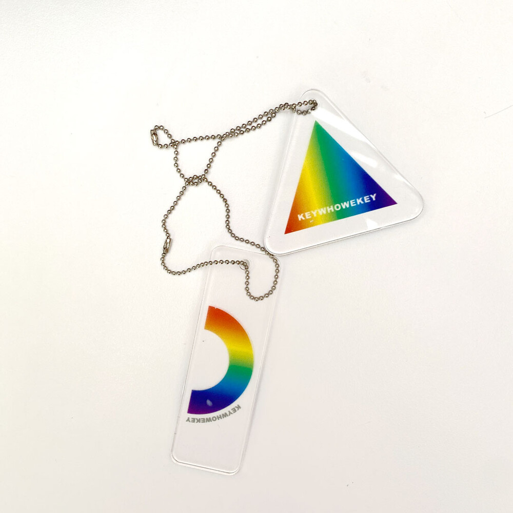 - 투명한 아크릴 세모모양에 무지개 색깔로 채우고 KEYWHOWEKEY 로고타입을 함께 실크스크린