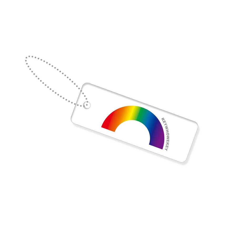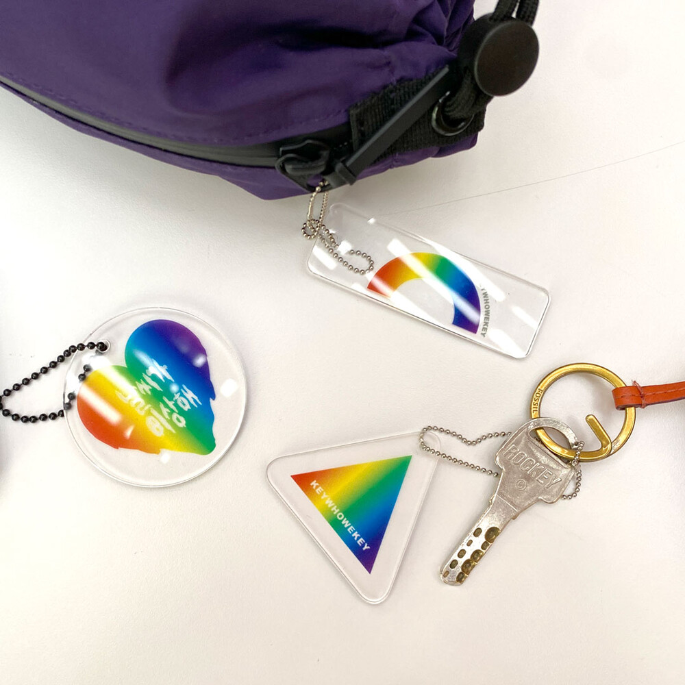 - 투명한 아크릴 직사각형모양에 무지개모양과 KEYWHOWEKEY 로고타입 실크스크린
