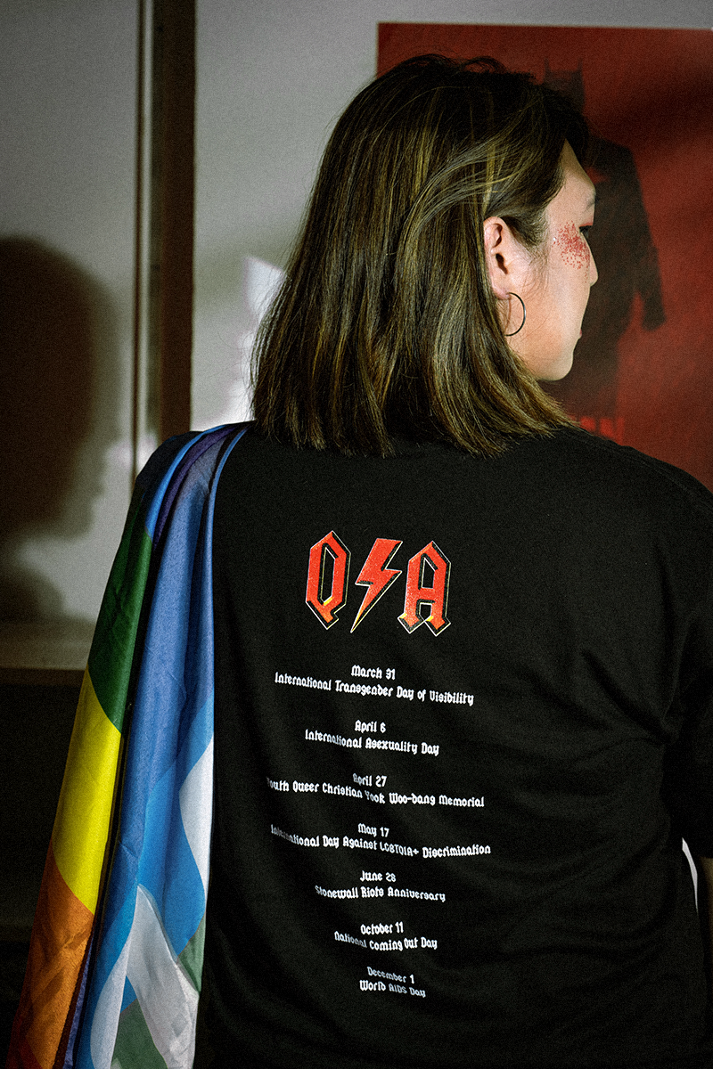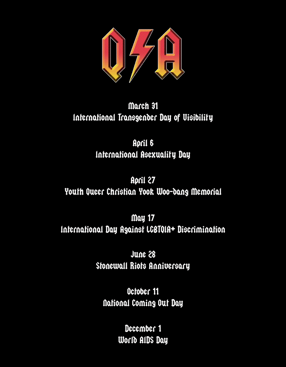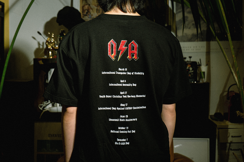뒷면에는 록 밴드 티셔츠 뒷면에 흔히 있는 공연 일정을 오마주해 주요한 퀴어 기념일들의 날짜를 인쇄했습니다.