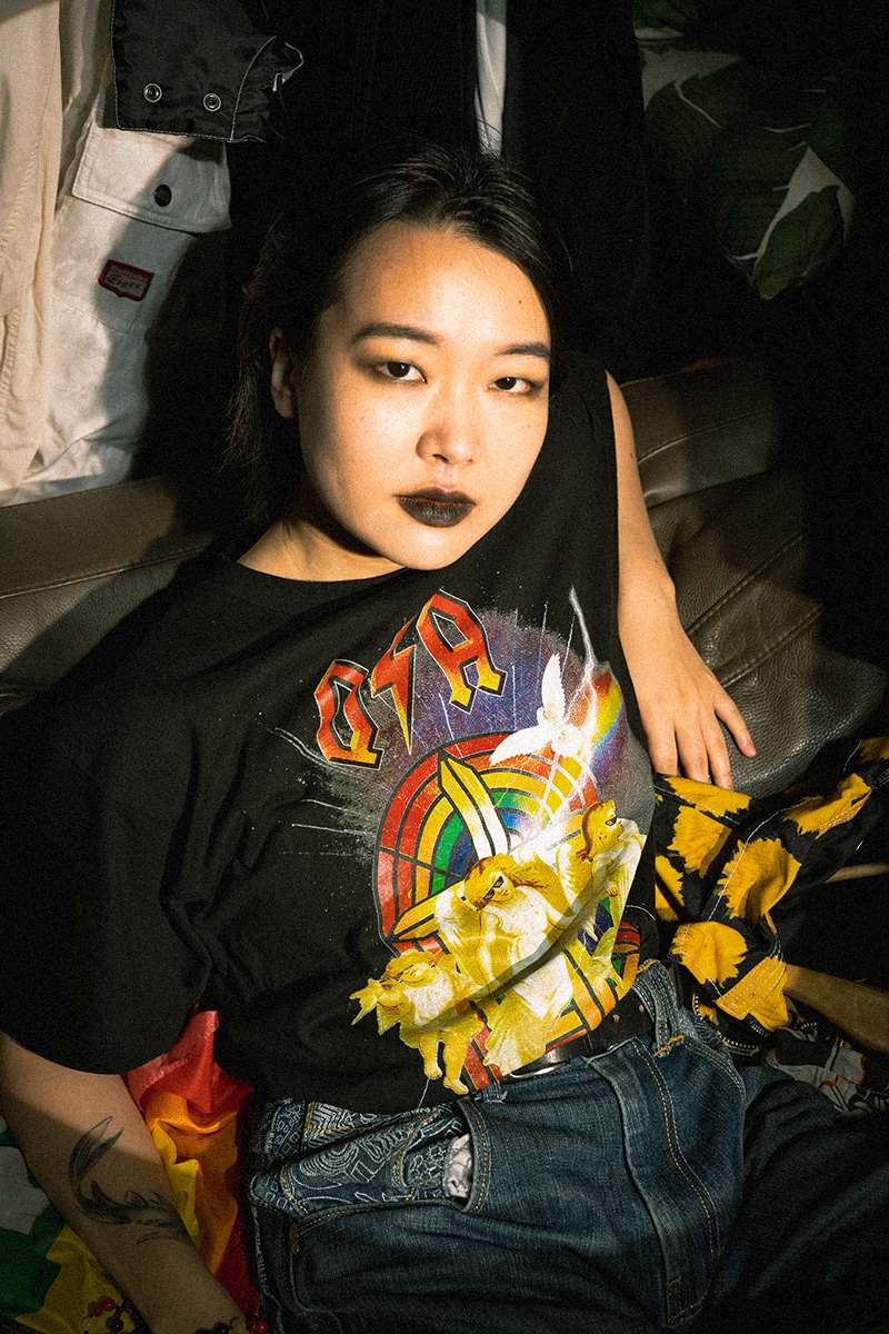 록 밴드 티셔츠의 빈티지한 무드를 살리면서도 선명한 무지개빛 색감을 표현하기 위해 위해, 비트맵 인쇄에 흔히 사용되는 전사 기법이 아닌 원색분해 실크스크린으로 인쇄했습니다. 망점이 그대로 보이는 특유의 거칠고 매력적인 질감을 확인해보세요.