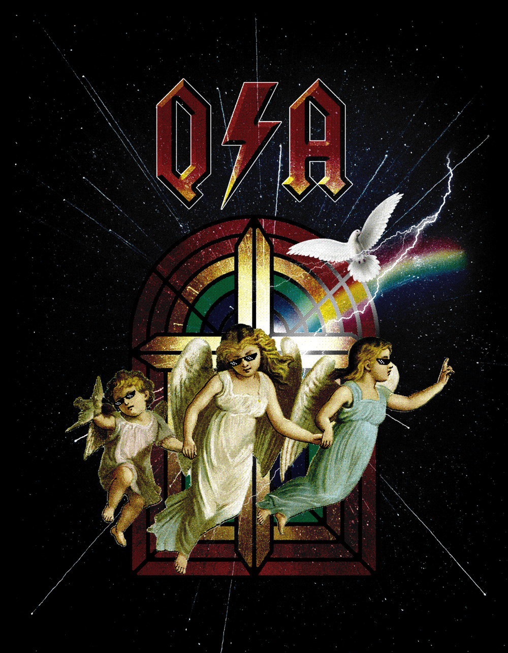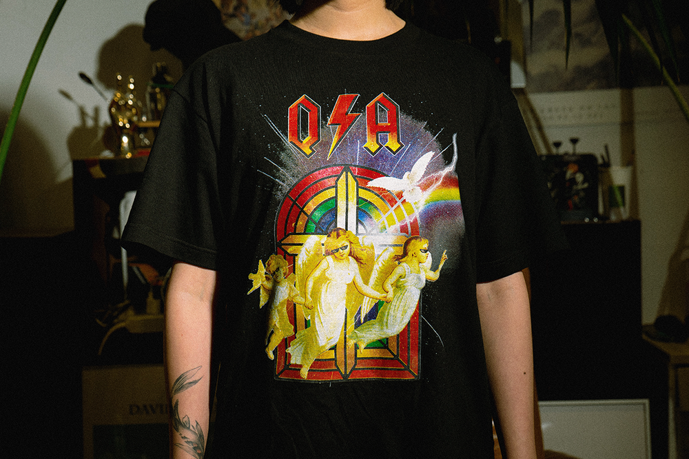 (모델 착용사이즈 2XL) 앞면에는 AC/DC 밴드의 로고를 오마주한 큐앤에이의 로고와 함께, 선글라스를 쓴 퀴브리엘과 두 명의 천사가 무지개 십자가 스테인드 글라스를 배경으로 날아가는 그림이 있습니다. 너무 멋져서 비둘기도 깜짝 놀란 모습이네요.