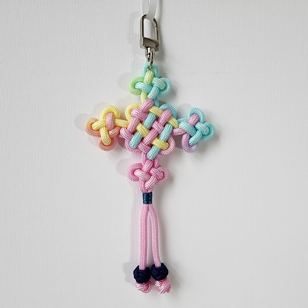 병아리매듭은 ‘수난을 이긴다’고 하여 무관의 칼 장식이나 노리개, 혹은 악기에 주로 사용되었습니다. 동봉해 드리는 원형 키링과 함께 의상, 가방 어디든 원하는 곳에 착용하시면 됩니다. 부드러운 색감을 원하는 분을 위해 색이 옅은 파스텔톤 무지개 끈을 사용했습니다.