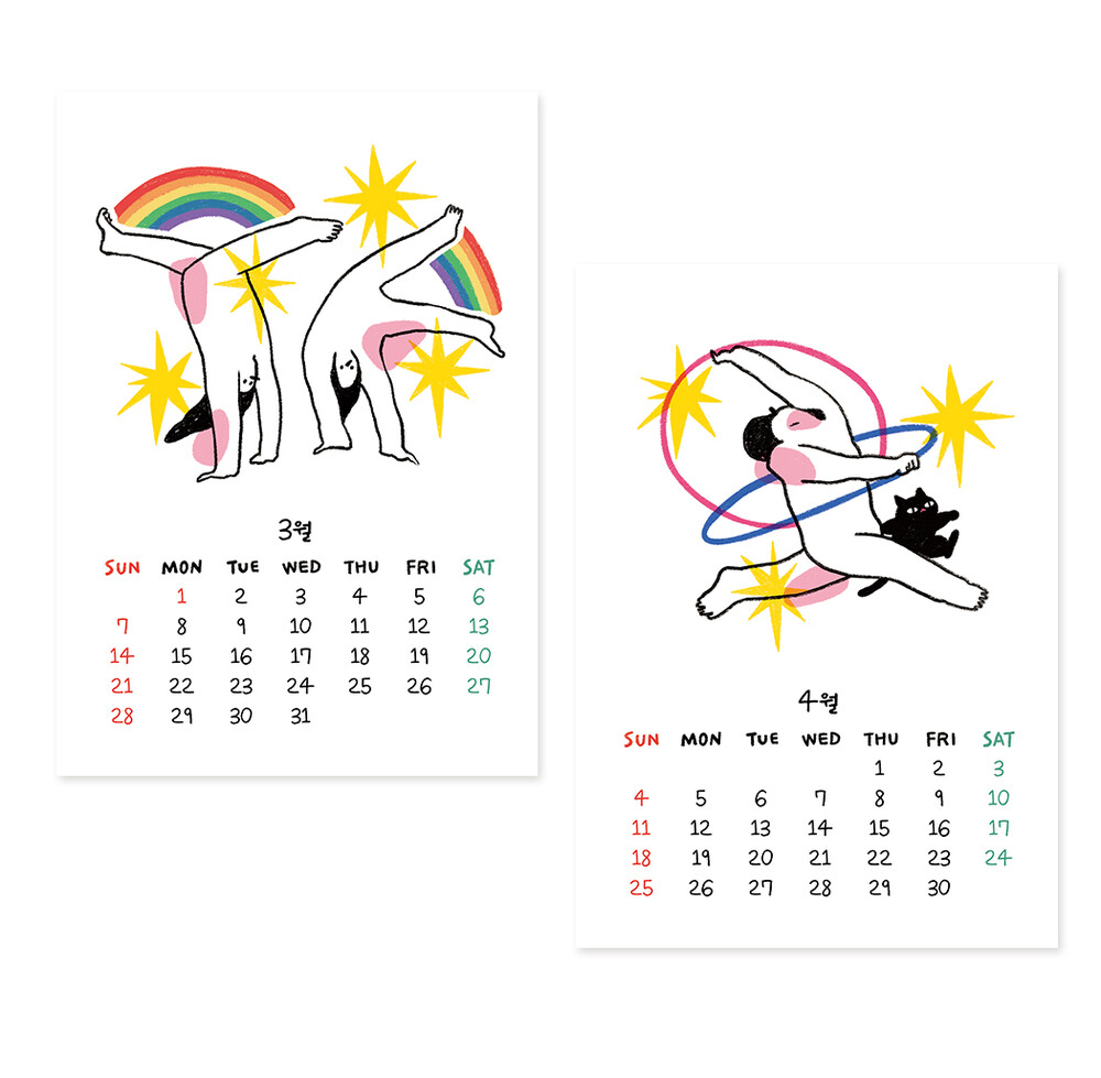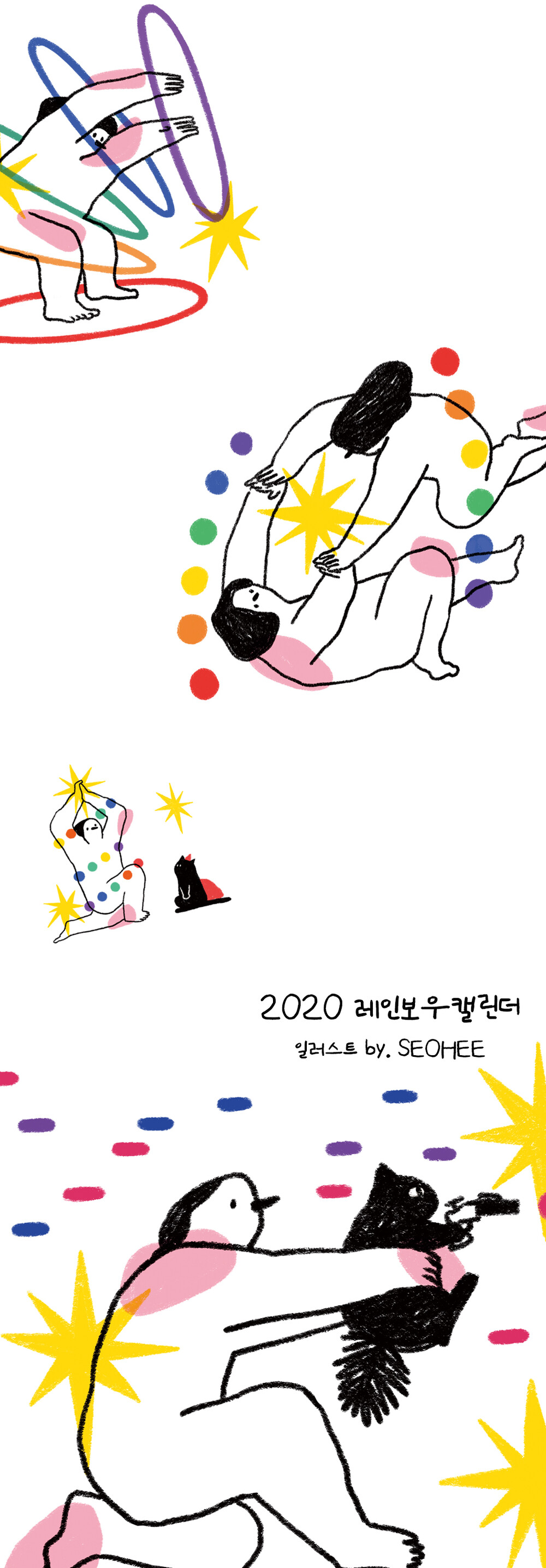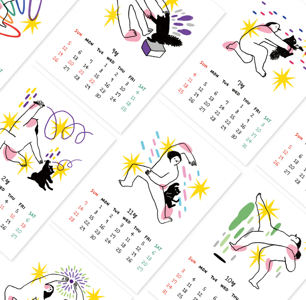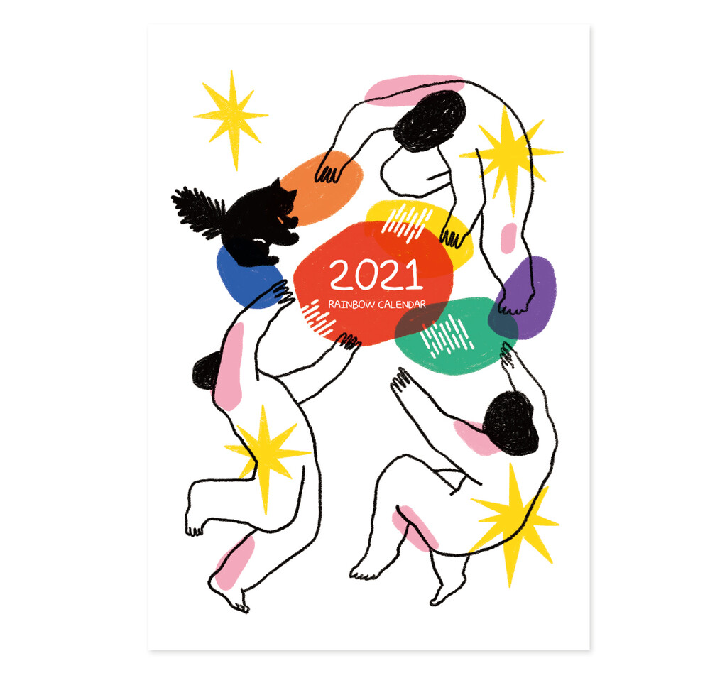 마음 내키는데로, 자유분방하게 움직이는 일러스트와 함께 2020년 내내 움츠려있던 몸을 쭉쭉 펴고 새로운 해를 맞아요. 2월은 인터섹스 자긍심의 색, 7월은 바이섹슈얼 자긍심의 색, 10월은 에이로맨틱 자긍심의 색 등 퀴어의 자긍심을 상징하는 색들이 곳곳에 자리해 있구요, 속을 알 수 없지만 나랑 놀아주는 고양이도 함께 해요.