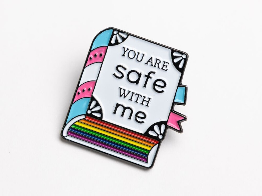 책 모양 속에 “YOU ARE SAFE WITH ME”라는 문구와 함께, 트랜스젠더 프라이드 컬러와 자긍심의 레인보우 프라이드 컬러를 조화롭게 담았어요.